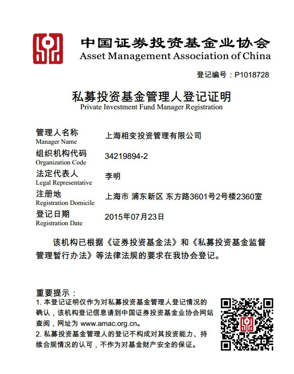 2015年6月,上海相变投资管理有限公司正式注册成立,同年获批私募基金管理人资格